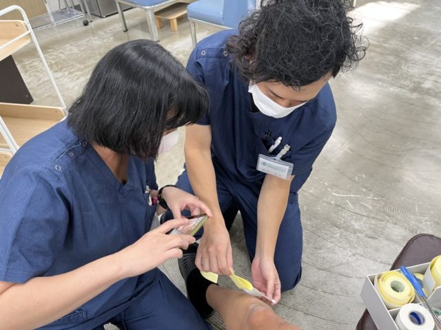 柔道整復師による膝の効果的なテーピングについてスタッフ同士で確認